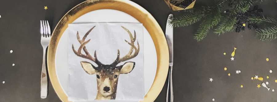 Esta idea puede sonar muy alocada pero verás como al final lucirá genial. Elige un solo color base para la mantelería de la mesa. Compra un paquete de servilletas de papel que tengan estampado. Elige el que más te guste, si es con tema navideño mucho mejor. Coloca una servilleta en cada sitio y listo. Tu mesa se verá simple pero sin ser aburrida, y si en casa tienes peques seguro que les encantará.